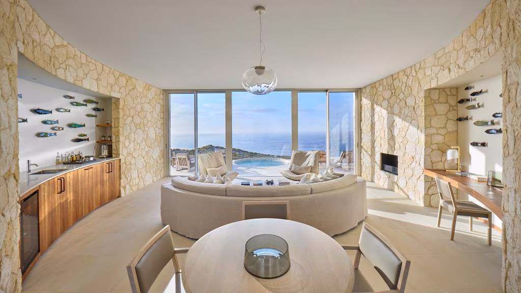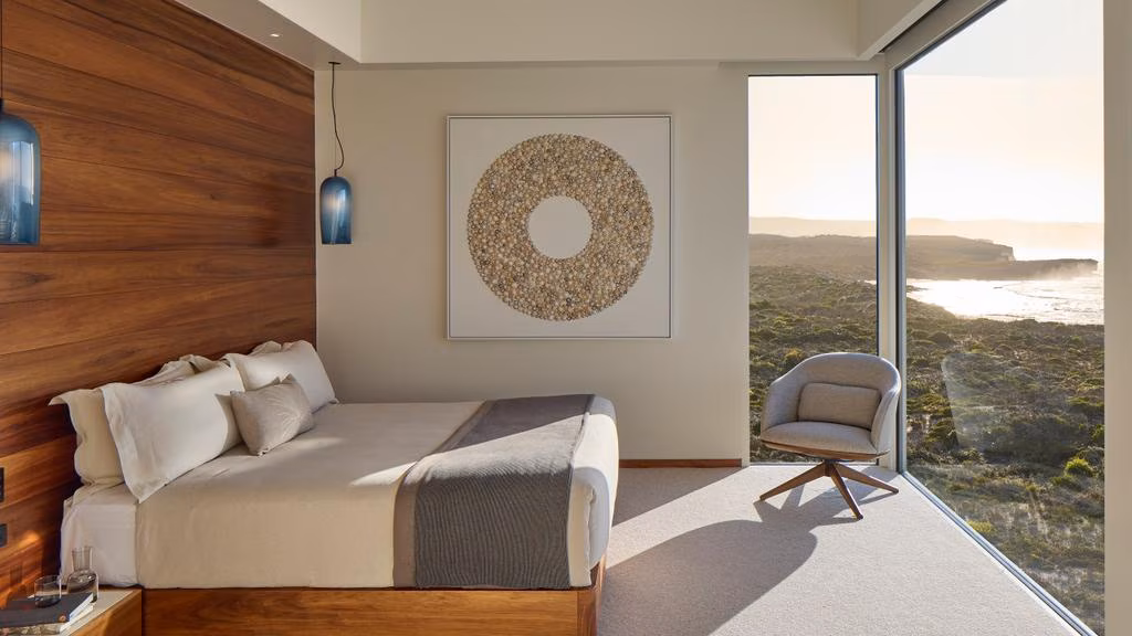 Today, the new Southern Ocean Lodge looks both familiar and fresh. The dramatic “Great Room” once again anchors the property, its floor-to-ceiling windows offering uninterrupted views of the wild Southern Ocean. Organic finishes, curved lines and natural stone echo the island’s landscapes, ensuring the lodge still feels deeply embedded in its setting.