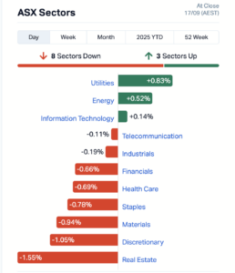 The rise in global oil prices as Ukrainian drone strikes continue to hit Russian oil refineries boosted local players with Woodside Energy Group (ASX:WDS) up 0.9%, Beach Energy (ASX:BPT) up 2% and Karoon Energy (ASX:KAR) jumping ~3%.