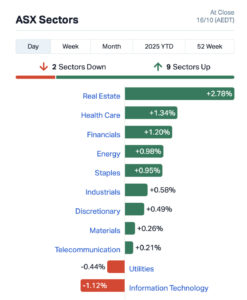 It was another strong day for financials with robust performances across the ‘Big Four’ banks, while healthcare also had another good day with the biggest name in the local scene, blood products giant CSL (ASX:CSL), leading the sector higher with a gain of 2.10%.