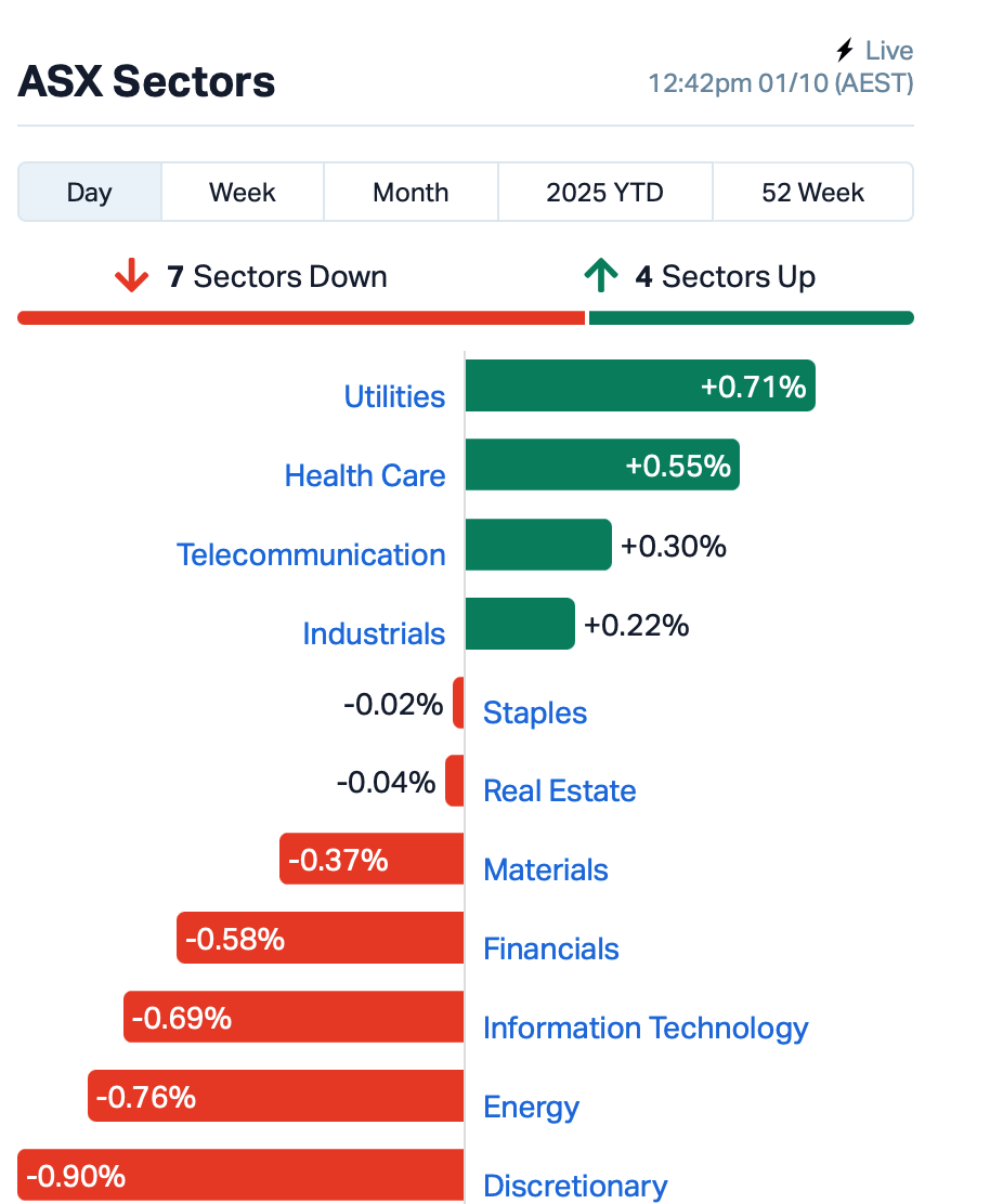 By lunch time in the eastern states, the ASX was down around 0.3% , with defensive stocks holding the fort while miners and lithium names sagged.