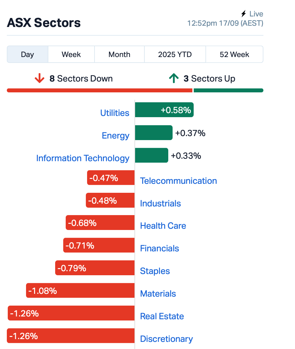 The ASX was looking a bit groggy by Wednesday lunchtime in the east, down about 0.7%.