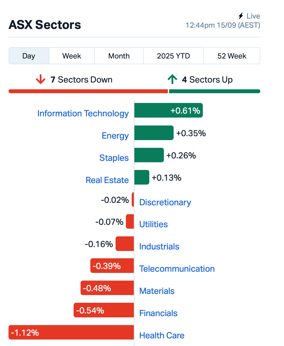 Healthcare, on the other hand, was down 1% and looks about as defensive as an umbrella in a cyclone. CSL (ASX:CSL) shed 1.5% and ProMedicus (ASX:PME) slumped to its lowest since July.