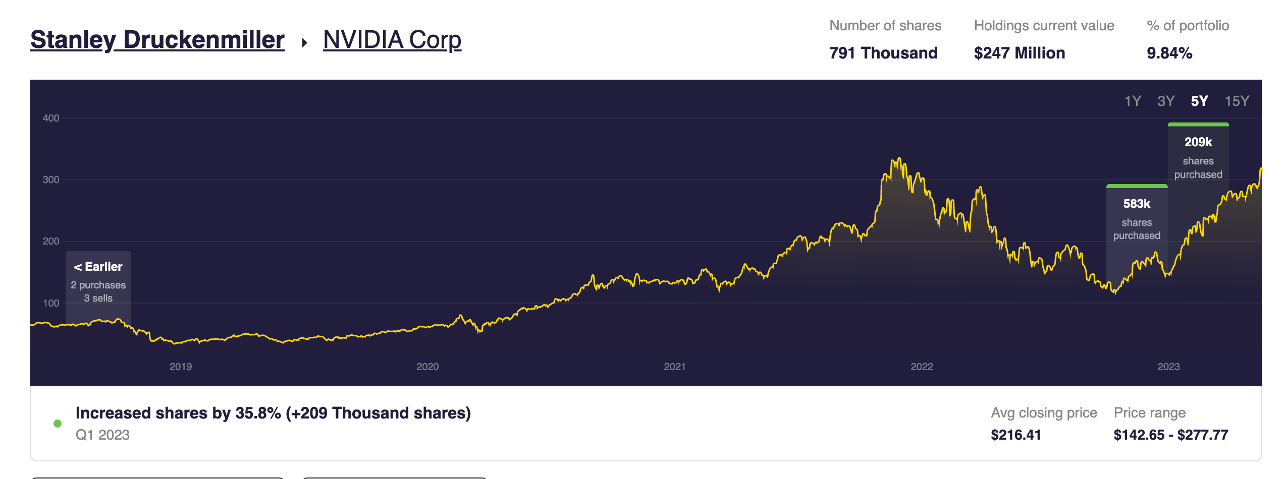 Druckenmiller snapped up 791,475 shares of NVDA worth about US$230m, taking its holding in the chipmaker from 582,915 shares worth $85.1 million as of end-2022.