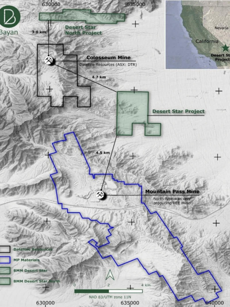 - Bayan’s Desert Star project sits 4.5km from Mountain Pass with similar geology and surface assays of up to 26,286ppm TREO