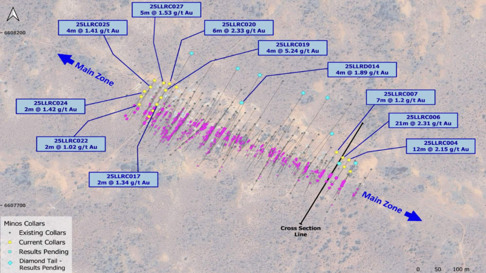 Assays from 25 of the 27 reverse circulation holes returned results topping up at 21m grading 2.31g/t Au from a down-hole depth of 115m including 8m at 4.67g/t from 128m in hole 25LLRC006.