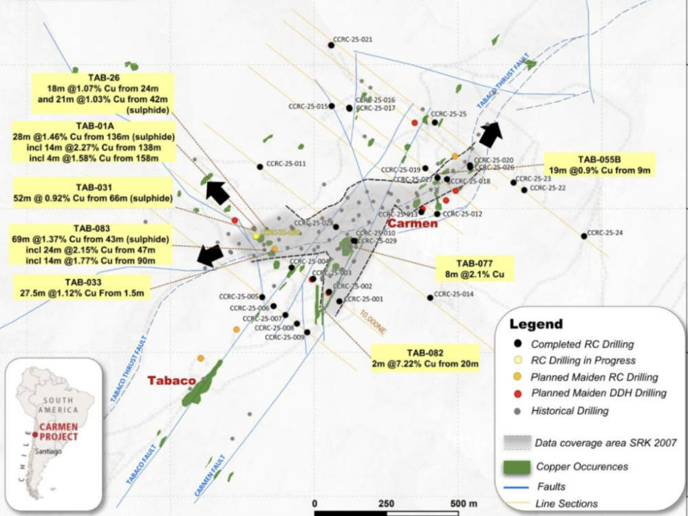 Intersections inside the current non-JORC NI 43-101 resource include 31m at 1.21% copper from a down-hole depth of 24m (TAB 26) while high-grade sulphide intervals below the resource include 26m at 1.58% copper from 29m (TAB 23).