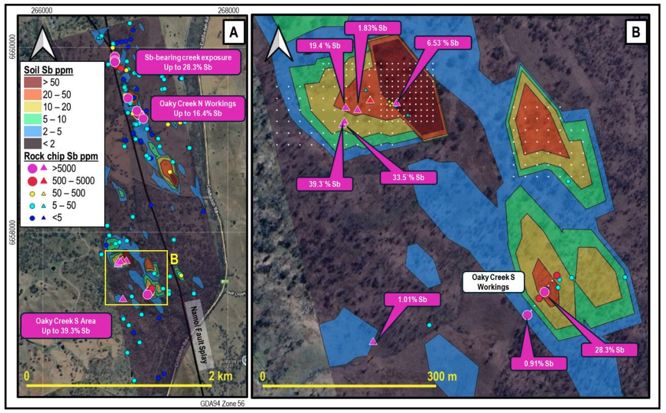 Mineralised samples have now been collected over a strike length of 500m at Oaky Creek South and 700m at Oaky Creek North with significant additional untested extensions indicated by the ~1.5km long antimony soil anomaly at Oaky Creek North.