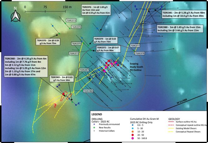 Besides the exploration drilling, the infill drilling portion of the program returned intersections of up to 5m grading 30.91g/t Au from 21m (TGRC055), which bodes well for optimisation of the southern pit in the updated scoping study.