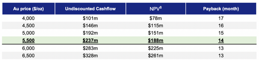 Using a conservative gold price of A$5500/oz, the study points to a pre-tax NPV of A$188m, 165% IRR and A$237m in free cash flow.