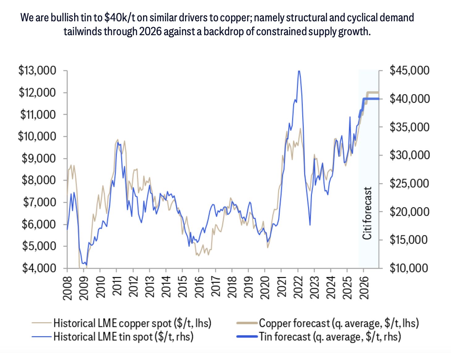 - Citi backs tin for a breakout, forecasting US$40,000/t by 2026