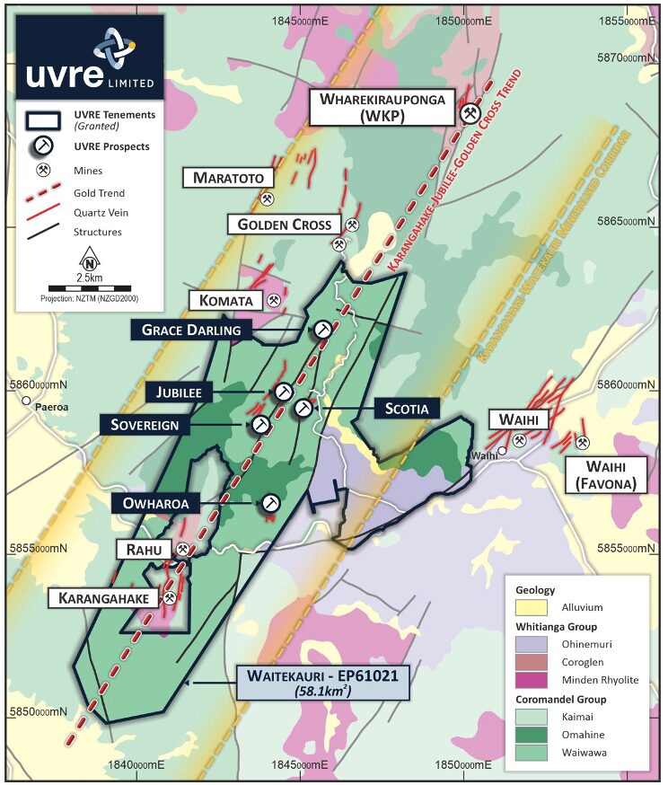 Uvre (ASX:UVA) Waitekauri project is a brownfields play 8km west of OceanaGold Corporation’s 10Moz Waihi gold mine, and along trend from three other +1Moz gold deposits in WKP, Golden Cross and New Talisman Gold’s Karangahake.