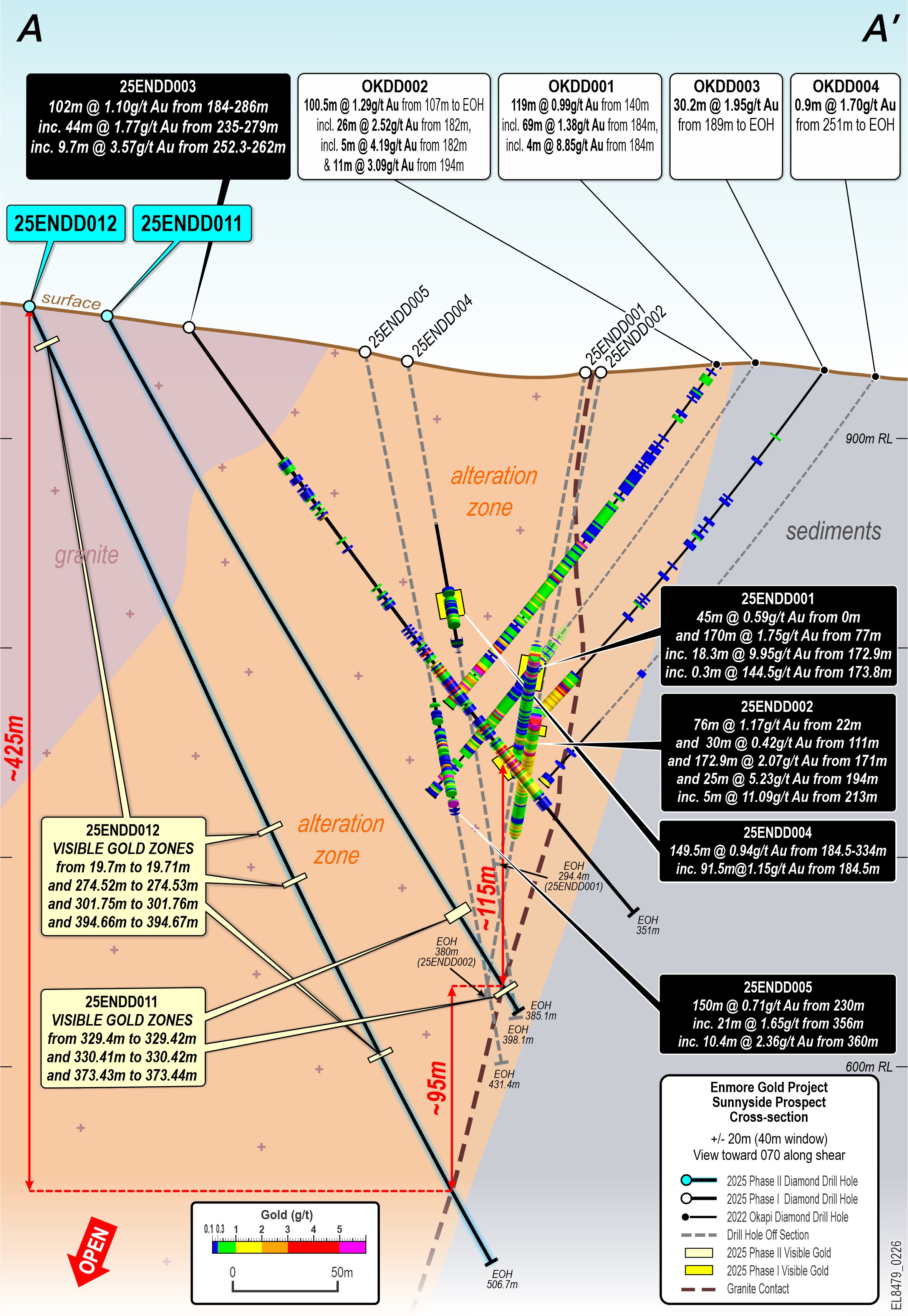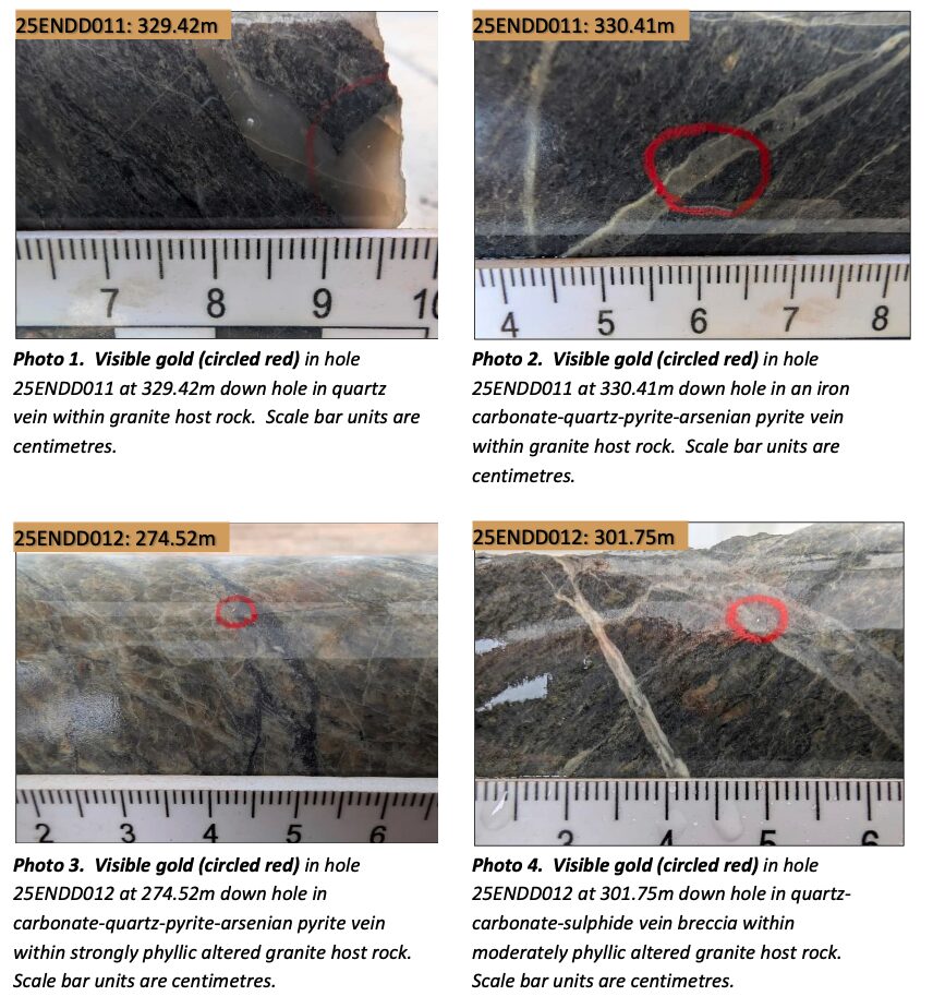 Drilled within the Sunnyside prospect, the VG intersections in 25ENDD011 and 012 are located beneath 25ENDD003, a diamond drill hole that returned 102m at 1.1g/t Au from 184-286m, including 44m at 1.77g/t Au from 235-279m, including 9.7m at 3.57g/t.