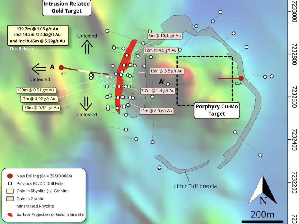 The first hole in the 2025 drill program was designed to test the down-dip extension of an intercept of 129m at 0.51g/t gold from 225m in hole ZMRDD0523 in the rhyolite intrusion on the western margin of the ring complex that defines the Red Mountain project.