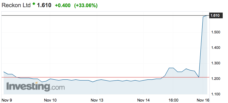 Reckon shares jumped 40c to $1.61 on the news, valuing the company at $181 million.